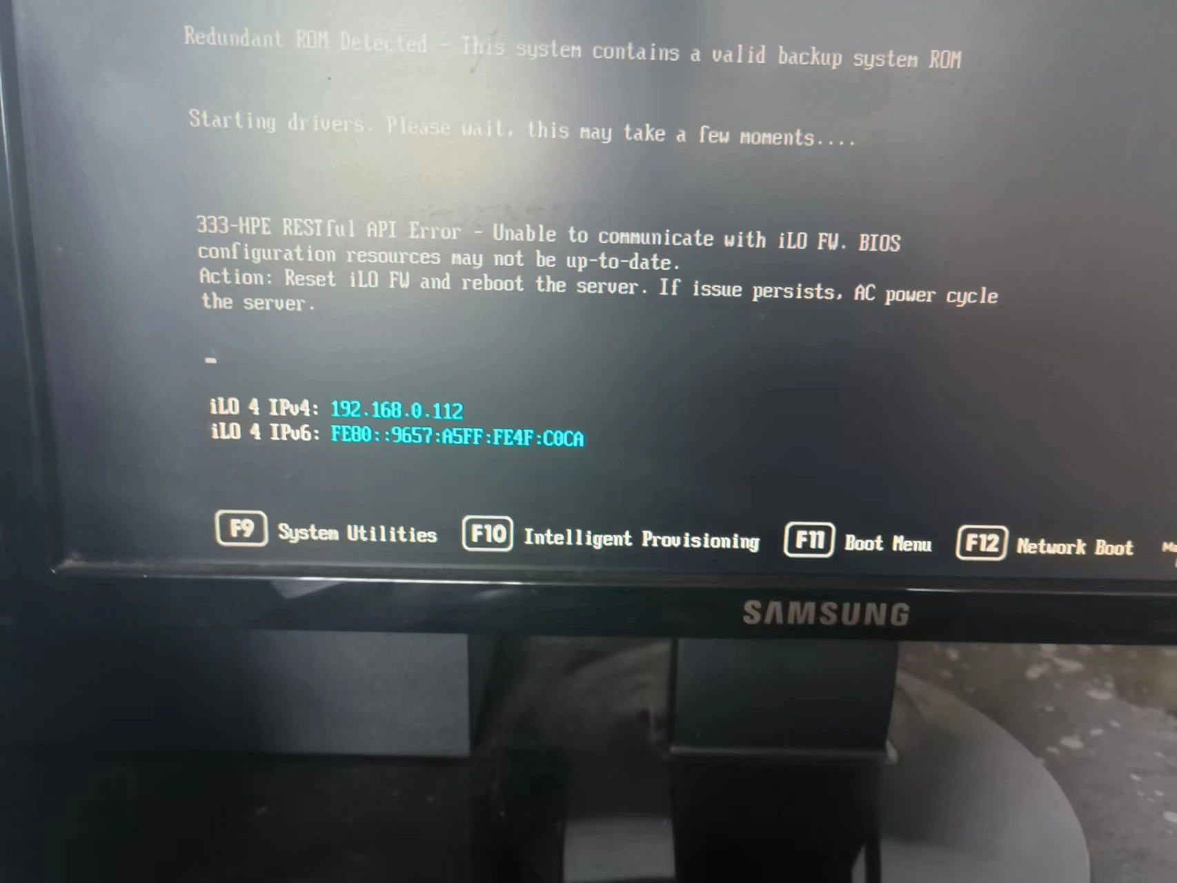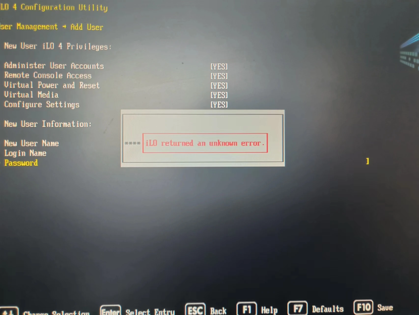 但开机后我遇到了一个意想不到的问题,惠普的服务器需要通过iLO进行管理,但这台机器的iLO似乎有点问题。具体而言,机器启动就会报一个iLO的错误,同时修改iLO的密码时也会显示未知错误: